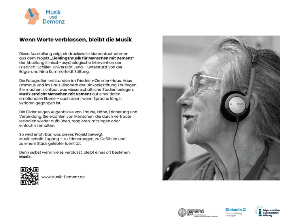 Die Ausstellung ist eng mit den wissenschaftlichen Erkenntnissen der Universität Jena verbunden. Studien zeigen, dass individualisierte Musik eine wirksame, nichtmedikamentöse und zugleich einfach umsetzbare Intervention ist, die Wohlbefinden steigert, Unruhe reduziert und soziale Interaktion fördert.